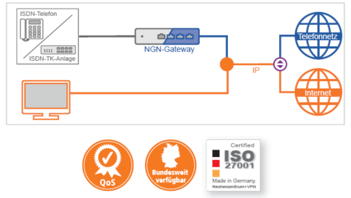 - Sie wechseln nur den Anschluss und behalten Ihre alte Anlage. Dabei stellen wir Ihnen einen IP-Anschluss zur Verfügung, der gemeinsam mit einem Gerät geliefert wird, das Ihrer alten Anlage das ISDN-Amt simuliert. Fragen Sie uns nach der office-flat NGN – mit ADSL oder VDSL-Anschluss.