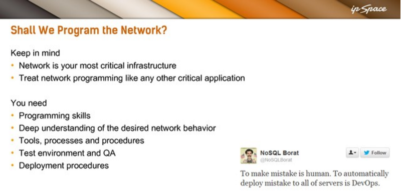 Fazit dabei ist, dass es keine fertige Kauflösung gibt, die nicht durch eigene Programmierung adaptiert werden müsste. Das würde von den Unternehmen häufig unterschätzt. Im oben verlinkten Foliensatz zielt Pepelnjak dann auf die Methodik ab, wie solche Prozesse denn einzuführen seien.