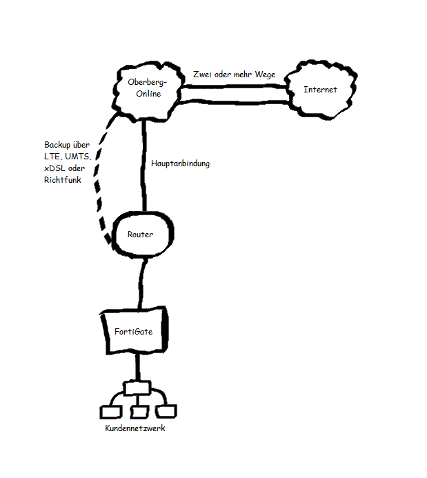 Szenario:Sie haben eine primäre Anbindung zu Oberberg-Online und nutzen IP-Adressen aus unserem Adressraum. Dieser Erstweg ist über einen Kabelweg (in Glas oder Kupfer) realisiert. Sollten Sie eine andere Anbindung an das Internet, z.B. als Direktkunde der Telekom, Vodafone oder eines anderen Anbieters betreiben, sprechen Sie uns auf Migrationsmöglichkeiten, bzw. technische Machbarkeit gerne an.