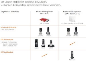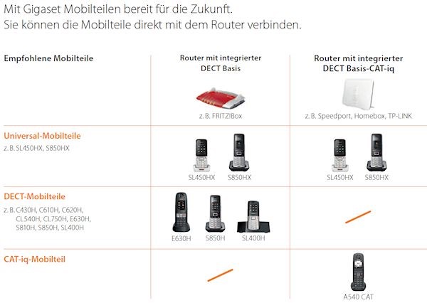 DECT-Protokoll, wie der FRITZ!Box, als auch mit Routern nach CAT-iq-Standard, zum Beispiel den aktuellen Speedport-Modellen der Telekom, der Homebox 2 von O2 und