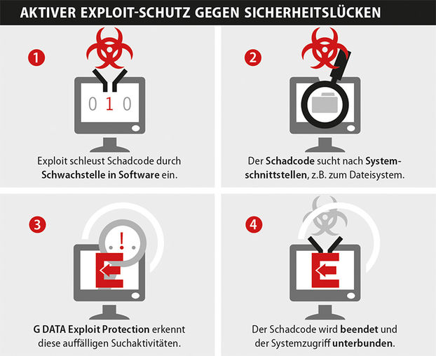 Mit G DATA wird das Ausnutzen einer Sicherheitslücke effektiv geblockt und das Ausführen der Schadcode-Infektion verhindert. Der Exploit-Schutz von G DATA überprüft das Verhalten der installierten Programme permanent auf Unregelmäßigkeiten. Wird ungewöhnliches Verhalten im Programmablauf festgestellt, blockiert die G DATA Sicherheitslösung den Angriffsversuch, stoppt den Eindringling und schlägt umgehend Alarm. Selbst vor bisher unbekannten Angriffen, sogenannten „Zero-Day-Exploits“, schützt der G DATA Exploit-Schutz.