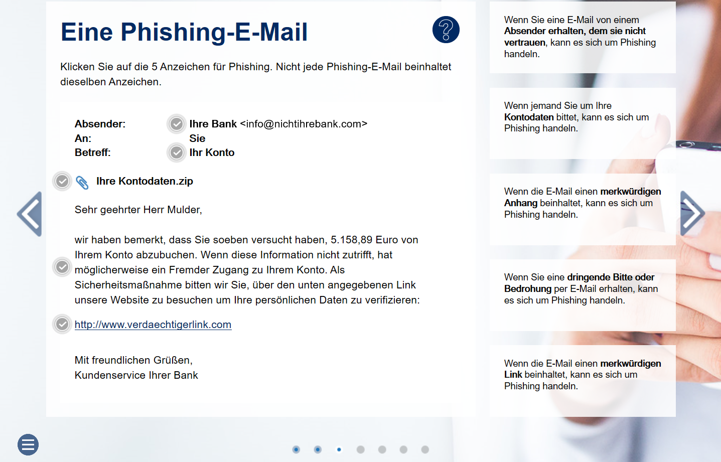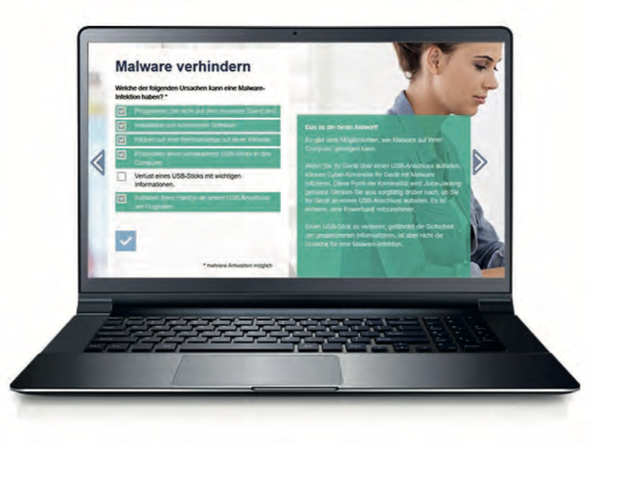 Phishing, Social Engineering, Brute-Force-Attacken: Viele Cyber-Angriffe nutzen ungeschulte Mitarbeiter als Schwachstelle aus. Hacker schicken unter falschem Vorwand Rechnungen, die Spionage Software auf den PC laden oder entschlüsseln in kürzester Zeit zu einfach gewählte Passwörter. Die Schulung im E-Learning-Format umfasst mehr als 30 Security Awareness Trainings, mit denen Sie Ihre Mitarbeiter wirksam für IT-Risiken sensibilisieren. Unser didaktisches Konzept kombiniert anschauliche Texte, Videos und Multiple-Choice-Fragen, die sich in Form von 10- bis 15-minütigen Lektionen leicht in die tägliche Arbeit integrieren lassen.
