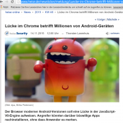 Wie auf heise.de vermeldet, soll eine Lücke in der V8 Java-Script Engine des Chrome-Browsers, der auf allen modernen Android-Smartphones zum Einsatz kommt, bestehen. Damit sollen Angreifer in der Lage sein, über besuchte Webseiten schädliche Applikationen nachzuladen. Nähere Informationen gibt es im o.a. heise-Artikel.