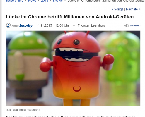Millionen Android Geräte gefährdet - Sichern Sie Ihr Netzwerk   Wie auf heise.de vermeldet, soll eine Lücke in der V8 Java-Script Engine des Chrome-Browsers, der auf allen modernen Android-Smartphones zum Einsatz kommt, bestehen.…